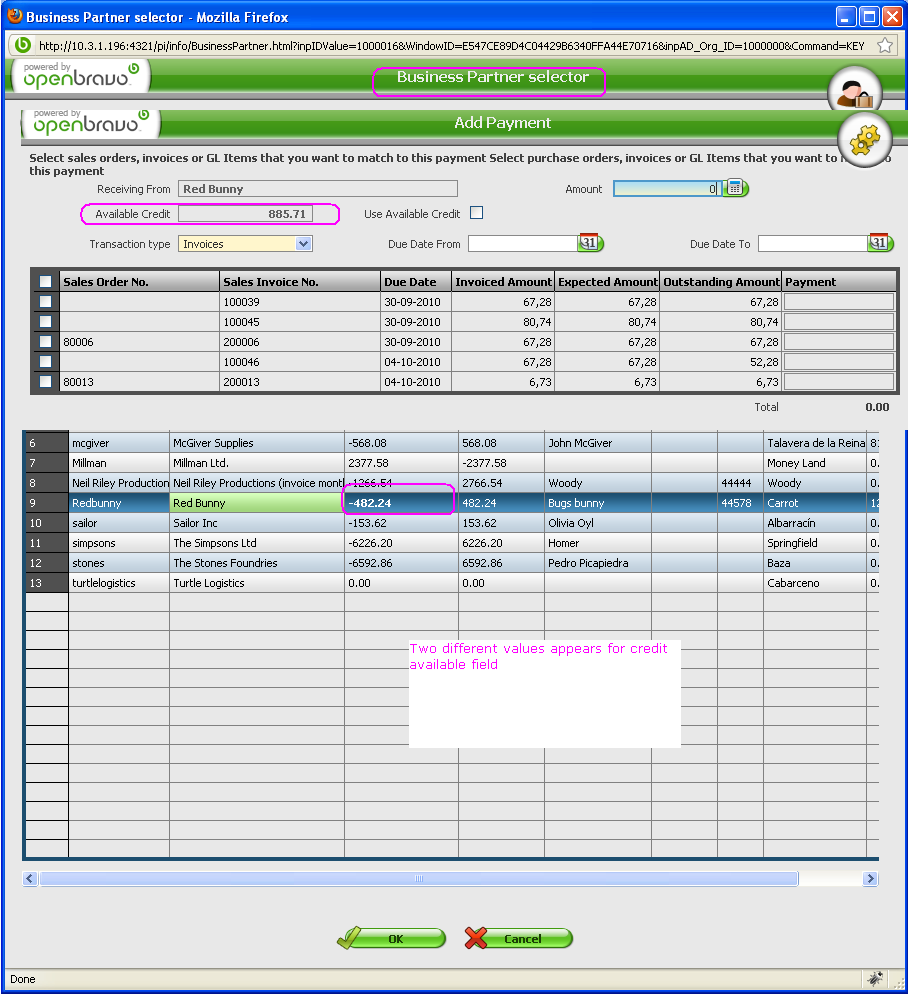 DescriptionTwo different values appears @ two different places for the same field "Available credit"(@ BP selector window & @ Add payment window)