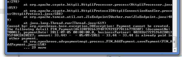 | Steps To Reproduce | ****Create Advance payment**** Login with: "User name": Openbravo "Password": openbravo "Role": QA testing Admin Go to Financial management || Receivables & Payables || Transactions || Payment Out Click New and select: Paying to: Vendor B Generated credit: 33.44 Change payment method to: 6(Spain) Click Save and verify: Document type: AP Payment Paying from: EUR - Spain Bank Currency: EUR Status: Awaiting Payment Click Add details button Do not select any invoice or order but select the option Leave this amount to be used later. Click Process Then it appears another pop-up window. Verify that the combo box Action regarding document has the value Process Made Payment(s)and withdrawal Click OK button Verify: Process completed succesfully green message appears Amount: 33.44 Status: Payment Made Description: Amount left as credit: 33.44 ********Create the purchase invoice**********+ Go to Procurement management || Transactions || Purchase invoice Click new and fill: "Transaction Document": AP Invoice "Business partner": Vendor B Click Save and verify: "Partner adress" : . Pamplona, Street Purchase center nÂș1 "Invoice Date": Current system date "Price list": Purchase "Currency": EUR "Payment method": 6 (Spain) "Payment Terms": 30,5 days Move to lines tab and click new Select the product Raw materials C and change the Invoice Quantity to 15.2 an save Then verify: "UOM": Bag "Net Unit Price": 2.00 "Net List Price": 2.00 "Tax": VAT 10% "Line net amount": 30.40 Move to the header tab and lick the complete button and verify: "Description": Invoice paid using credit: {Document No of payment created in FINa10} - 13/07/2011 - Vendor A - 33.44 In the status bar "Payment complete": Yes In the status bar "Total Net Amount": 30.40 In the status bar "Total Gross Amount": 33.44 In the status bar "Document Status": Completed ******* Things that are wrong********* 1. Notice the "Description" field is not populated as it should be and remains blank. This is wrong 2. Notice it has created two payments (See attach): 2.1 One because of the payment method itself with 33,44 amount. Status withdrawn not cleared. This is wrong 2.2 Another one because of the Advance automatic payment feature with amount 0,00 and not processed (Status: Awaiting payment) with no lines. This is wrong 3. Finally it creates another transaction in the financial account so we are paying double to this vendor. this is wrong | |||||||