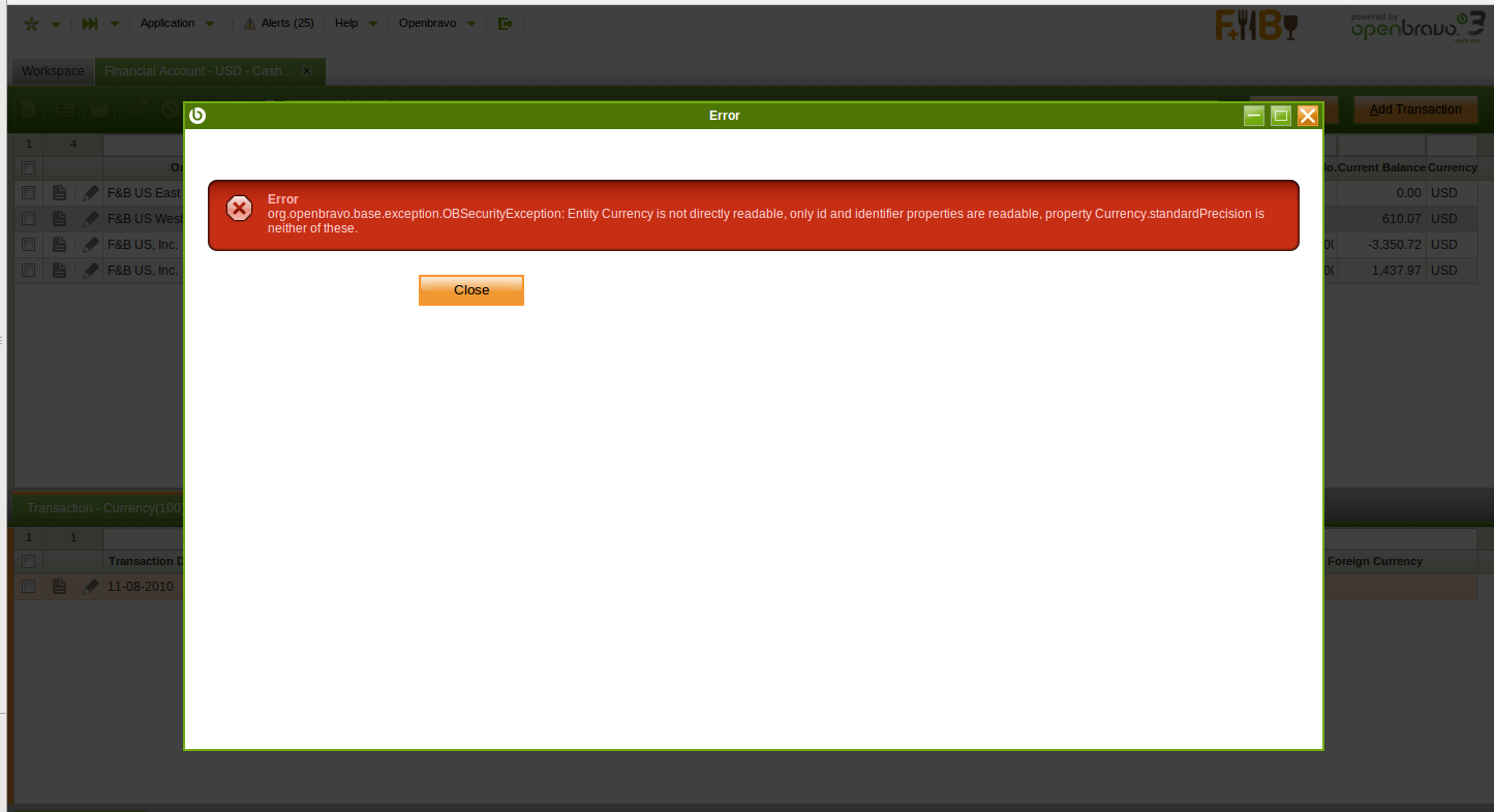 org.openbravo.base.exception.OBSecurityException: Entity Currency is not directly readable, only id and identifier properties are readable, property Currency.standardPrecision is neither of these.