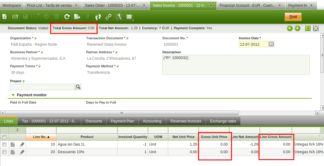 | Steps To Reproduce | 1. Enter as F&B Internation Group Admin role 2. Go to Price List window 3. Edit "Tarifa de Ventas" record by marking it as Including Taxes 4. Go to Sales Invoice window 5. Create a new document for "Alimentos y Supermercados" business partner 6. Create a new line for "Agua sin gas 1L" 8. Enter a discount of 10% 9. Complete the invoice 10. Gross Unit Price and Line Gross Amount fields on sales invoice lines contain correct values. 11. VOID the invoice 12. Go to the created reversal invoice 13. Realize that the total gross amount of the header is = 0 This is because the "Gross Unit Price" and "Line Gross Amount" fields haven't inherited the values from the original invoice. | |||||||