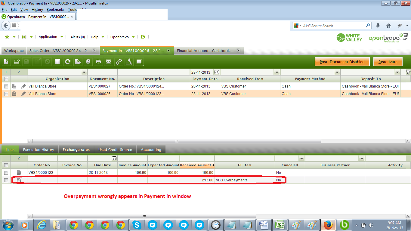 | Steps To Reproduce | 1) create a receipt, with return line a) Product: Adhesive body warmers Qty:1 unit price:3.60 line total amount: 3.60 b) Product: Baby Carrier Qty: -1 unit price: 110.50 line total amount: -110.50 <Return Line> total gross amount: -106.90 complete the receipt. 2) Navigate to payment in window, and verify the payment details which is created automatically after completing the above receipt at lines tab one can find two lines at lines tab a) invoice amount:-106.90 expected amount:-106.90 Received amount: -106.90 GL Item: <Blank> b) invoice amount:<blank> expected amount:<blank> Received amount: 213.80 Gl Item : VBS Overpayments Defect: In Payment in window, over payment record wrongly appears. | |||||||