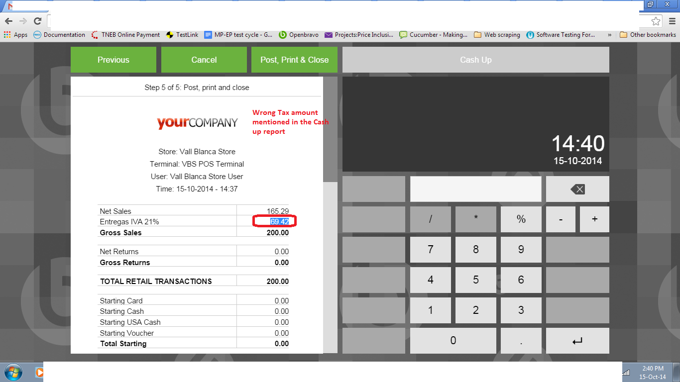 | Description | In cash up process at "step 5 Post, Print and close" , Tax amount shows wrong value. | |||||||