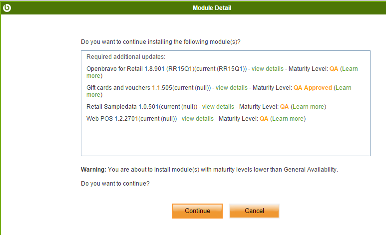 | Steps To Reproduce | Get RR15Q1 version as follows: Version: 1.8.900 org.openbravo.retail.pack 1.3.2700 org.openbravo.retail.discounts 1.2.2700 org.openbravo.retail.posterminal 1.0.1800 org.openbravo.retail.config 1.0.1600 org.openbravo.mobile.core 1.0.700 org.openbravo.retail.returns 1.0.500 org.openbravo.retail.sampledata 1.0.2200 org.openbravo.retail.poshwmanager 3.1.37 org.openbravo.agingbalance 1.0.1 org.openbravo.financial.cashflowforecast Check for updates and get the next minor update available. Go to update process and check the current values for the installed versions as shown in the screenshot. | |||||||