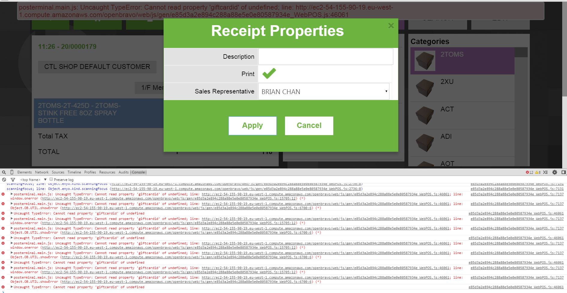 | Steps To Reproduce | 1. Create a ticket with a line (any product). 2. Open the item menu 'Receipt Properties' and select a different 'Sales Representative' or enter a description. 3 Click 'Apply' --> The error 'Cannot read property 'giftcardid' of undefined' is raised. | |||||||