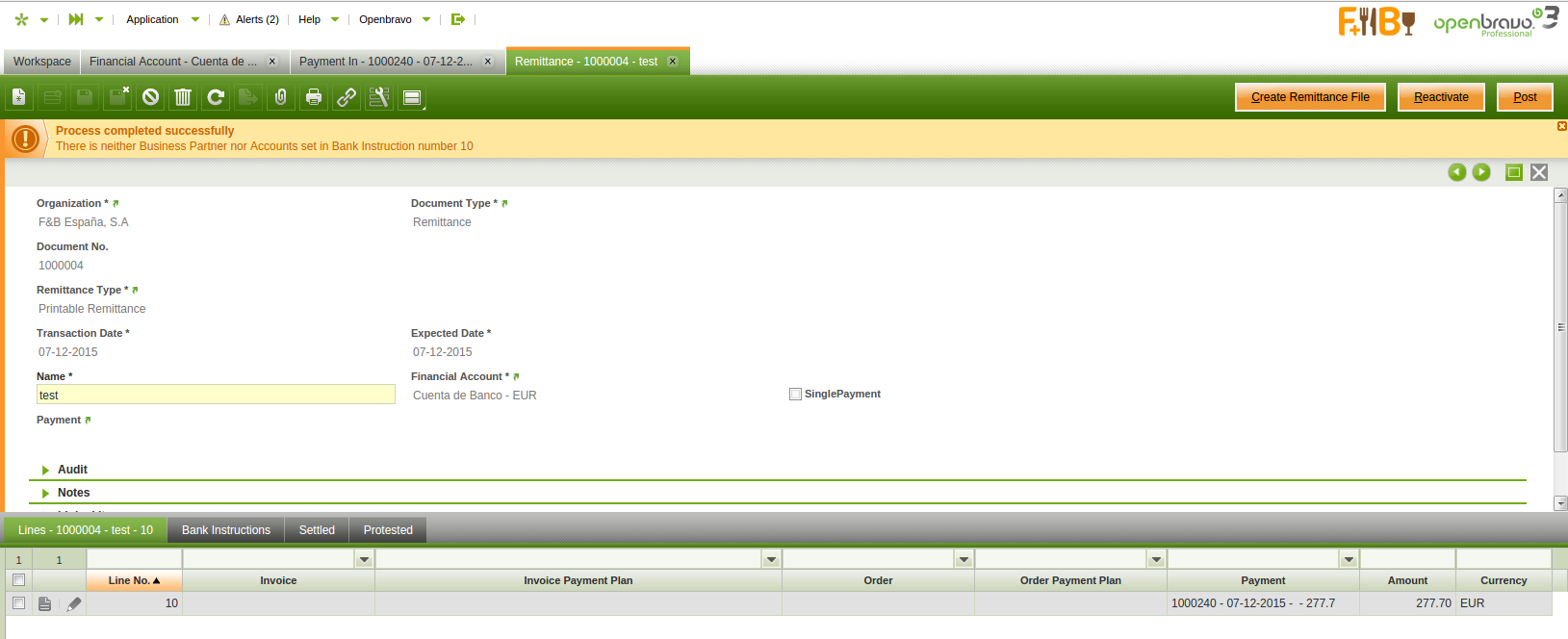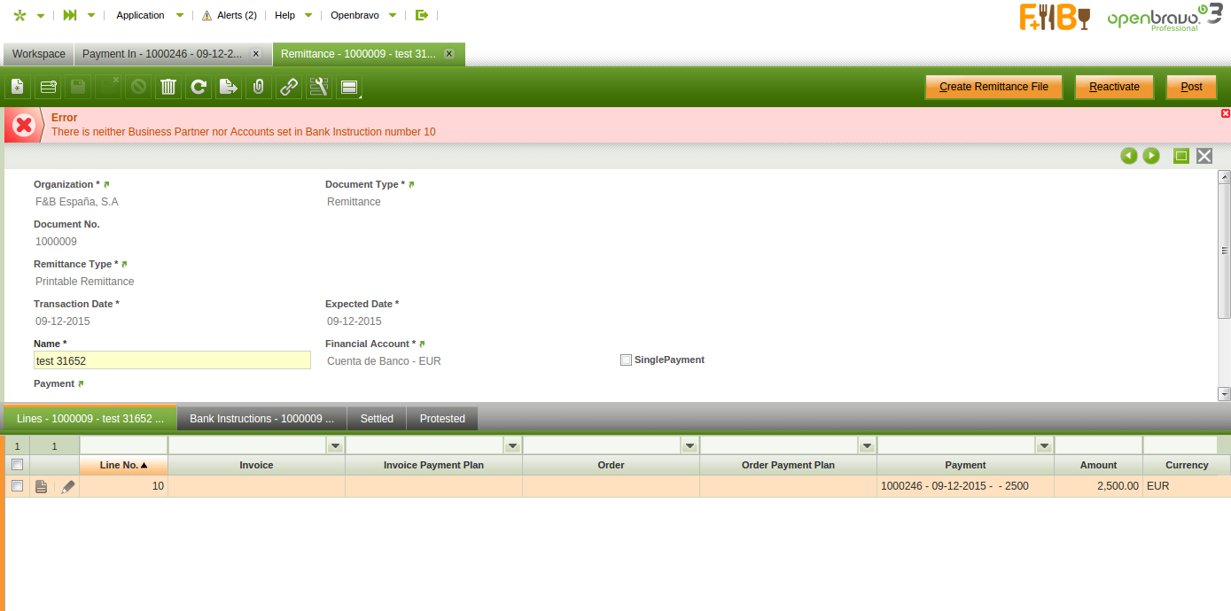| Steps To Reproduce | Go to Payment In window and create a new one by entering below setup: - Organization: F&B España - Received From: empty - Payment method: Cheque - Deposit to: Cuenta de Banco - EUR - Amount : 0.00 Press Add Details. Remove the filter if any on Order/Invoice section. Select only one invoice and enter the amount shown in the column "Outstanding Amount" in the field "Amount" and in the field "Actual Payment" located up. Select the action regarding document: Process Received Payment(s). Press Done. Take note of the created payment: for instance 1000240. Take note of the due date of the invoice related: for instance 24-12-2014 Go to remittance window and create a new one with below setup: Organization : F&B España Remittance Type: Printable Remittance Transaction Date = Expected Date = 07-12-2015 Financial Account = Cuenta de Banco - EUR. Name = Test Press Select Payments. Remove the filter if any. Search by the payment created. Once shown, select it and press Done. Press Process. An error is shown saying: "There is neither Business Partner nor Accounts set in Bank Instruction number 10". See image attached. Therefore it will not be possible to create a remittance file while do not having the business partner specified. In that case an error will be shown saying there is not a business partner, neither an Account set. Same behavior in the case of creating a payment in with no BP in the header and including two payment lines one for a different BP (Restaurantes Luna Llena and Hoteles Buenas Noches). See image attached. Once selected that payment to be included in the remittance, only one bank instruction line is created with no info in the field "Business Partner". There is no way in that case to enter the corresponding BP, neither create the remittance file. Openbravo should split the payment created by BP in Lines tab. | |||||||||||