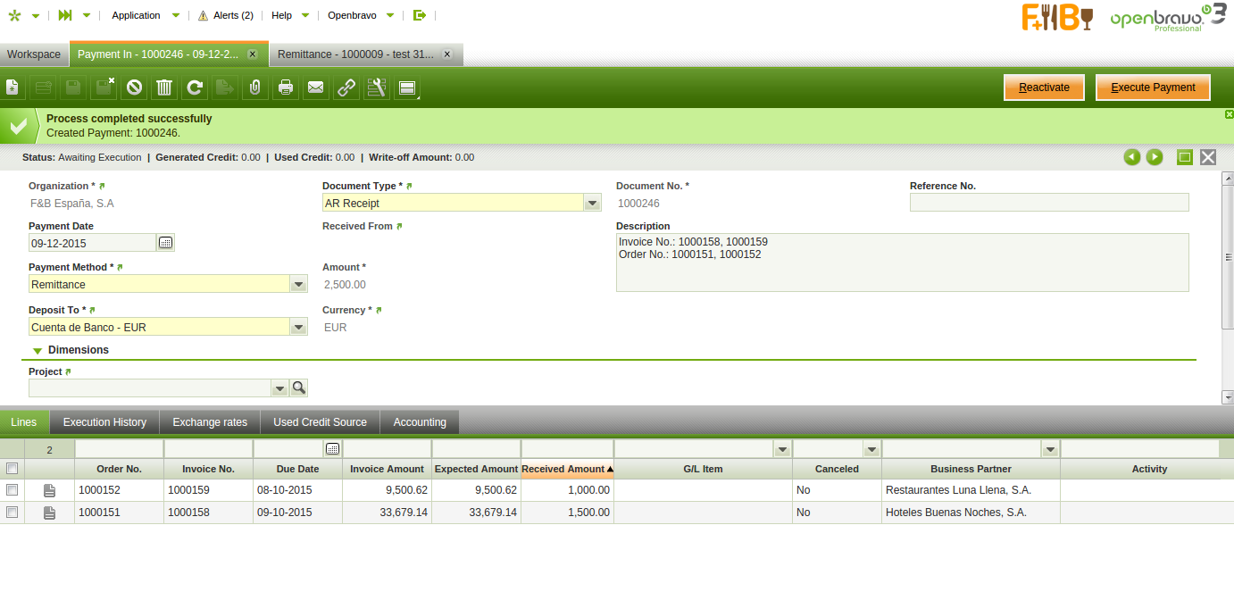 | Proposed Solution | In the case of including only 1 BP in a payment in, it is possible to select the Business Partner later on in the tab "Bank Instructions", however that information should be taken automatically from the payment lines. But: Same behavior in the case of creating a payment in with no BP in the header and including two invoices, therefore payment lines one for a different BP (Restaurantes Luna Llena and Hoteles Buenas Noches). See image attached. Once that payment is selected in a remittance, only one bank instruction line is created with no info in the field "Business Partner". There is no way in that case to enter the corresponding BP, neither create the remittance file. Openbravo should split the payment created by BP in Lines tab. | |||||||||||