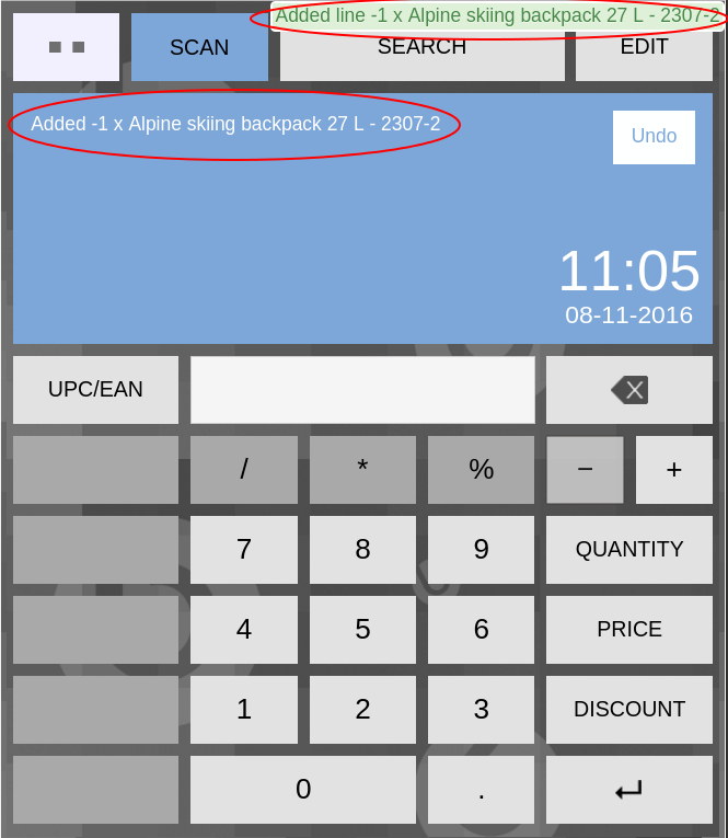 | Description | When filling a receipt, the messages shown when removing an item/changing item quantity for a certain product ("Added -n x <product>") could be replaced by "Removed n x <product>". Could improve user experience. | |||||||||||
