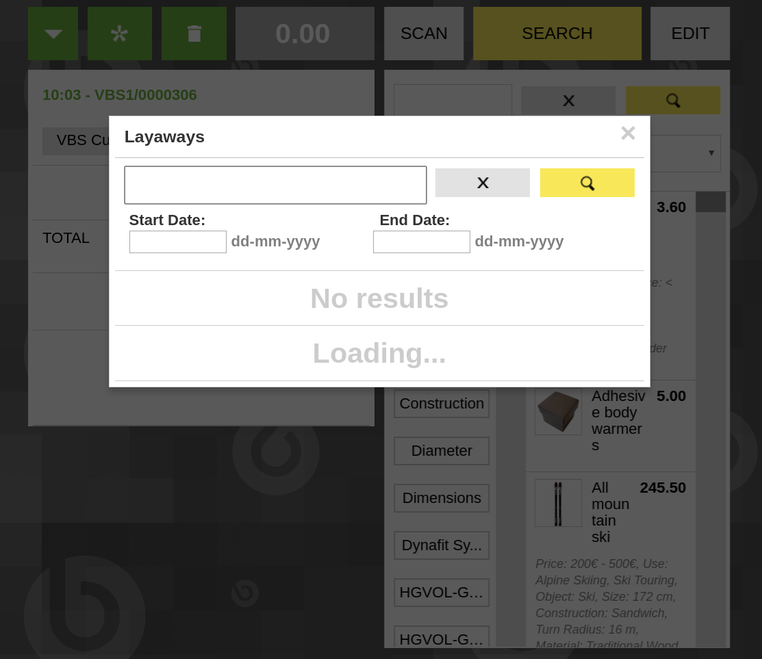 | Description | After searching in Layaways popup "Loading..." label is shown, after that, if Layaways popup is opened and the user clicks again in search button. Two labels are shown: "No results" label is shown above "Loading..." label. To reproduce this issue it is required to use HighVol. | |||||||||||