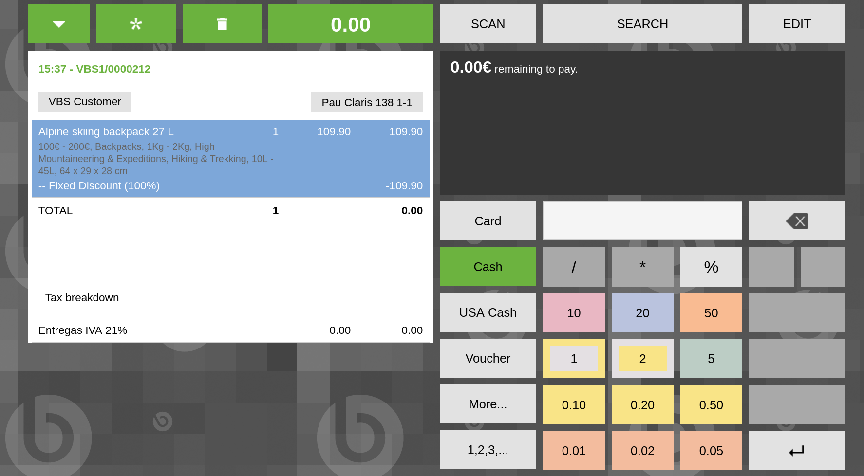 | Steps To Reproduce | 0-In POS Backend, configure the following discount: -- Go to Discounts and Promotions window Click Ctrl + D to create new record Navigate to Header tab Discount type: Fixed Percentage Discount Name: Gift card_Fixed 100% Printed Name: Fixed Discount (100%) Starting date: 01-01-2013 Included Products: Only those defined Discount: 100 Navigate to Products tab Product: Alpine skiing backpack 27 L Click Ctrl + S to save the record -- 1-Login POS as vallblanca. 2-Add 1x Alpine skiing backpack 27 L, click Total Amount button and complete that receipt with no payment required. 3-Add 1x Alpine skiing backpack 27 L. Then, click Total Amount button and realise it is shown "0.00€ remaining to pay." but no buttons appear. | |||||||