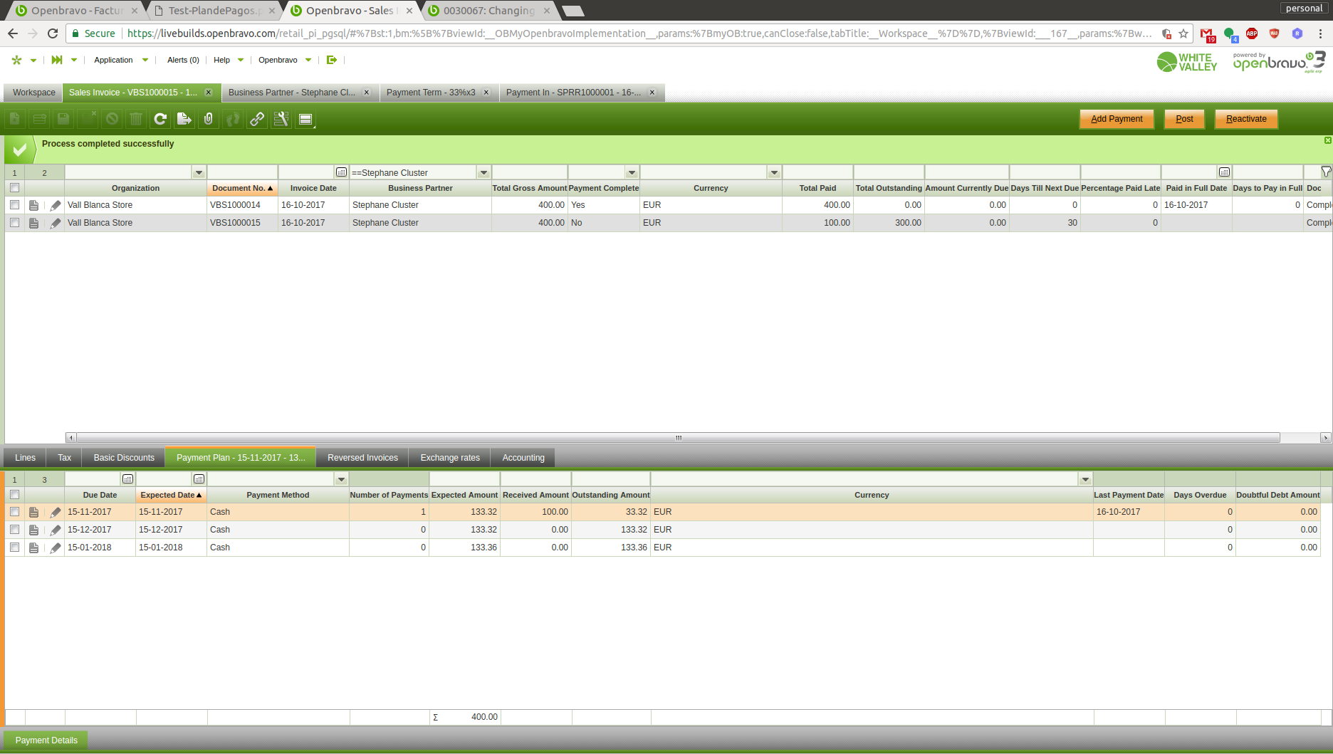 Reactivate and complete the invoice again: the payment plans are regenerated with correct values. See attachment rightPaymentPlan2.png
