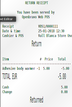 | Steps To Reproduce | -Start Hardware Manager -Login into Web POS user : Vallbalanca -Add Adhesive body warmer product to the receipt. -Press return line button and pay the ticket in cash. -You will see in the HM that the payment is 5.00 and it must be -5.00. -If you open this receipt and reprint it you will see 5.00 and it must be -5.00. | |||||||