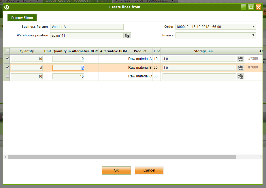 | Steps To Reproduce | Login As System Administrator Go to Preference window and create a new preference: Client = System Organizatin = * Property = Enable UOM Management Value = Y Visible at Client/Organization/User/Role/Window = all of them empty. 1. Login as QA Admin user 2. Create a Purchase Order header with the following data: -Type: Purchase Order -Business Partner: Vendor A -Warehouse: Spain warehouse -Payment method: 1 (Spain) 3. Create three lines: -Line 1: 10 Quantity of "Raw Material A" -Line 2: 10 Quantity of "Raw Material B" -Line 3: 10 Quantity of "Raw Material C" 4. Book the Order 5. Create a new Goods Receipt header with the same date of the Order 6. Click the "Create Lines From" button to open the pop up 7. Complete all the related data. Mark the line for Raw Material A to full return and set Raw Material B to 8 (as shown in the screenshot) 8. Accept the changes and check the result. Note the line for Raw Material B was set to 10 instead (as shown in the second screenshot) | |||||||
