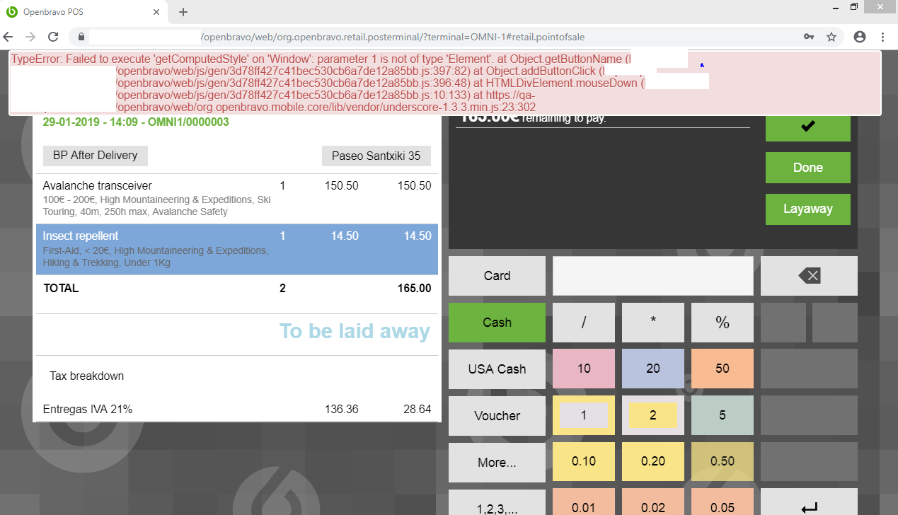 | Steps To Reproduce | 0-Log POS as vallblanca. 1-Add 1x "Avalanche transceiver" to the receipt. 2-Click Total Amount button. 3-Click "tick" button and click "x". DEFECT: A javascript error is thrown. | |||||||