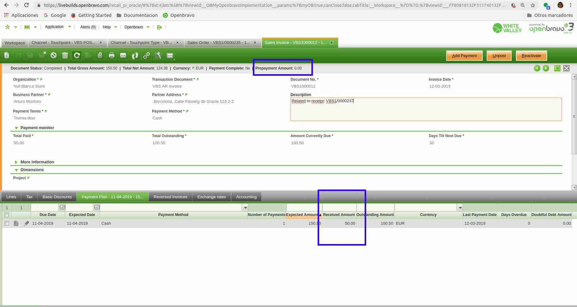 | Steps To Reproduce | Setup Channel-Touchpoint Type as: - Generate Invoice for Orders = Yes - Group orders in one invoice = No - Allow prepayments and partial payments = Yes In Web POS create a new sale for Arturo Montoro. Make sure it is select as Invoice = Yes. Enter 1 unit of product Avalanche Transceiver. Check that total sales is 150.50. Prepay only 50.00. Enter approval credentials and approve. Go to Openbravo backoffice and verify that no prepayment information is shown in the field Prepayment Amount of the corresponding sales invoice. See image attached. Same applies to any other scenario in which an order (ticket) is prepaid in Web POS, and the corresponding invoice is created. | |||||||