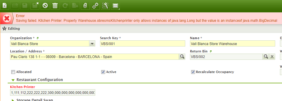 | Description | The Restaurant Management module adds a field Kitchen Printer to the Warehouse and Storage bin window. This field has no limit, generating an error message in case the user floods it with a valid but huge value. | |||||||||||