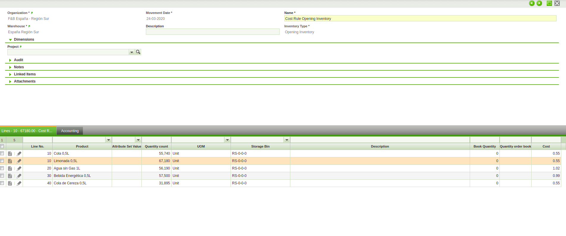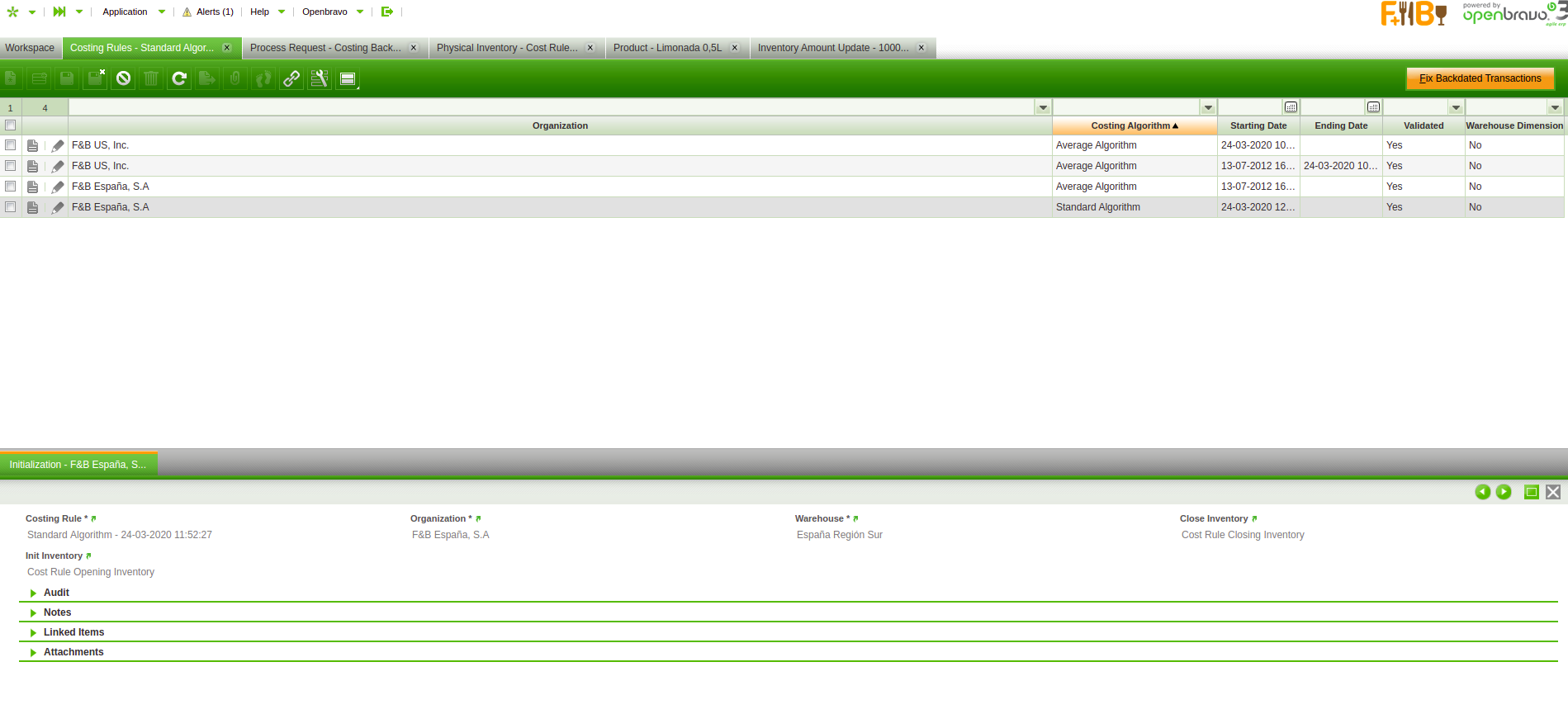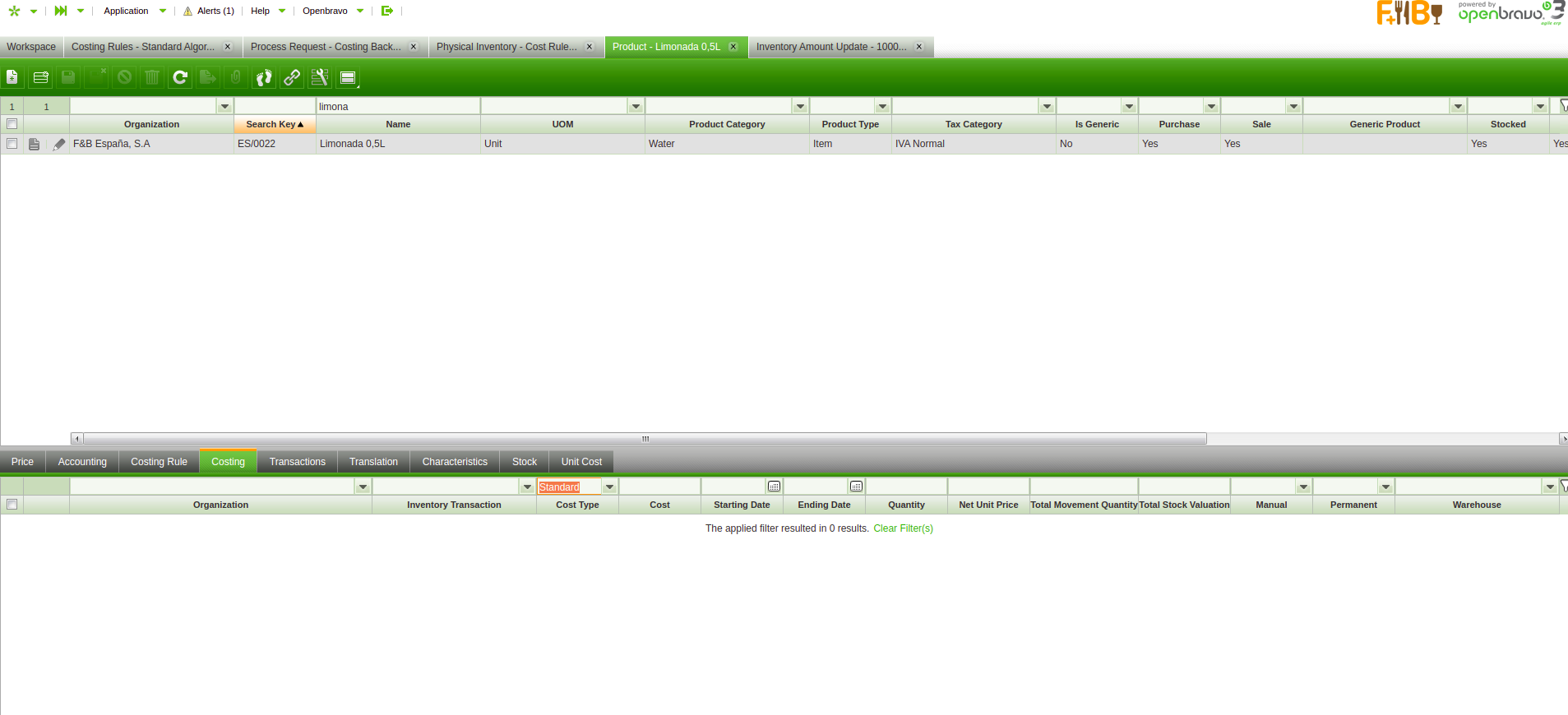| Steps To Reproduce | * Go to Openbravo livebuilds latest version without modules, access with role F&B International Group https://livebuids.openbravo.com/retail_stable_pgsql_pi/ [^] * Go to Costing Rules tab, check that there are only two entries, one for each Organization and both for Costing Algorithm of type Average Algorithm * Create a new one: Organization = F&B España, S.A., Costing Algorithm = Standard Algorithm. Leave the resting fields with their default values * Click on button Validate Costing Rule * Go to window Process Request, select the Costing Background Process. Go to its Process Monitor tab, every 5 minutes a new entry should appear here, wait for the new one to appear (refresh tab if necessary). There is a message on the log “No standard cost defined for given product and date. Org:F&B España, S.A, Product: Zumo de Naranja Bio 0,33L” when it should be creating this cost * Go back to Costing Rules, select the created one. Go to Initialization tab, select line for España Región Sur, click on link Init Inventory. Get one Product name that appears here on lines (ie: Limonada) * Go to Product window, search for that product (Limonada), go to tab Costing, add filter to search for Standard on Cost Type column. Notice that there is no standard cost here created. * Go to Inventory Amount Update window. Create a new one for Organization F&B España, S.A. On Lines create a new one for that previous product (Limonada), set a new Unit Cost, for example 1.5. Click on button Process. Wait for the Costing Background Process to be executed. Check again for that product if there exist Standard Cost (nothing created here neither) | |||||||