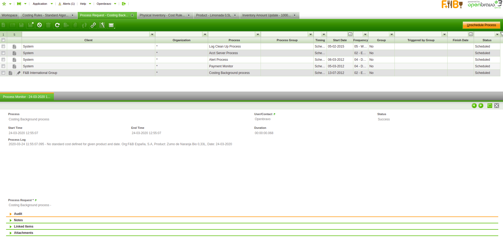--Test Plan Mantis-- As the F&B International Group Admin role: - Go to the Process request window and open the Costing Background Process record. Press the Unschedule Process button. - Create a new record with every field as default. Put "Costing Background Process" in the Process field. - Go to the Costing Rules window and create a new record for Organization "F&B España, S.A" and "Standard Algorithm" as Costing Algorith. Press the Validate Costing Rule and Done in the popup window. - Go back to the Process request window and press the Schedule Process in the previously created record. #In this moment the necessary standard costs are generated# |