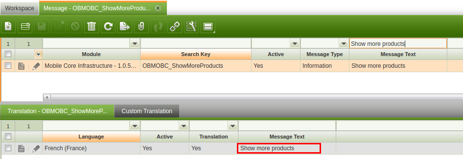 | Steps To Reproduce | Check message OBMOBC_ShowMoreProducts, french translation is available but not translated | |||||||