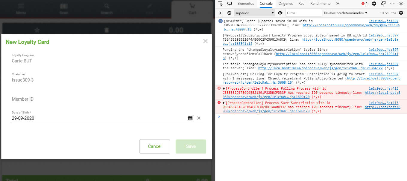 | Description | When a new loyalty subcription is created for a customer in Web Pos and the subcription program fails by a connection time out no error is shown in the Loyalty subcription popup and the subsciption is registered in the local database even thought no subscription is saved in the backend. This part is correct, but the problem is that the registration popup remains stuck, with the "Cancel" and "Ok" buttons disabled, as the polling request failed and the error was not handled properly | |||||||