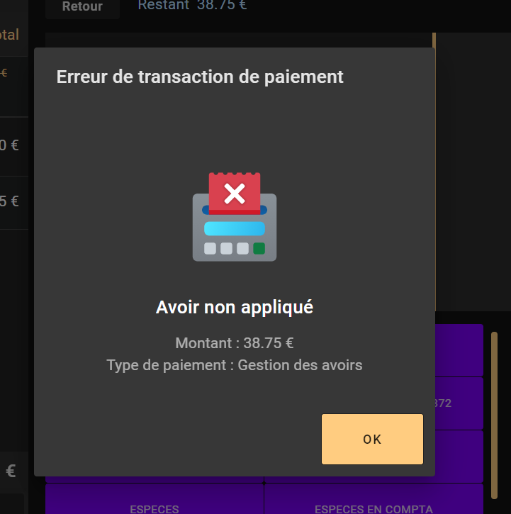 | Description | A pop-up is not needed when paying use case : - do a ticket and then go to payment screen - select as payment method credit note - Close the without tipping anything, a message error id displayed and requires an additional validation → this message is useless → I think the better approach is to put a message at the bottom left so that the process is not blocked like in my screenshot. | |||||||