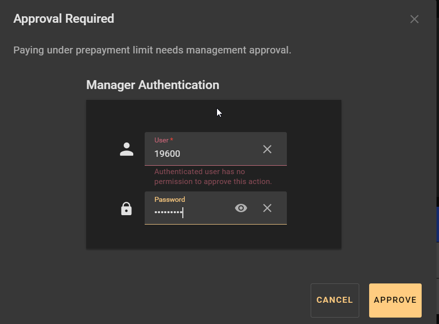 | Description | The manager approval doesn't work well when the cashier wish modify the prepayment amount by something smaller than the prefilled amount. Actually the manager can not approve even though he has rights to do it. | |||||||