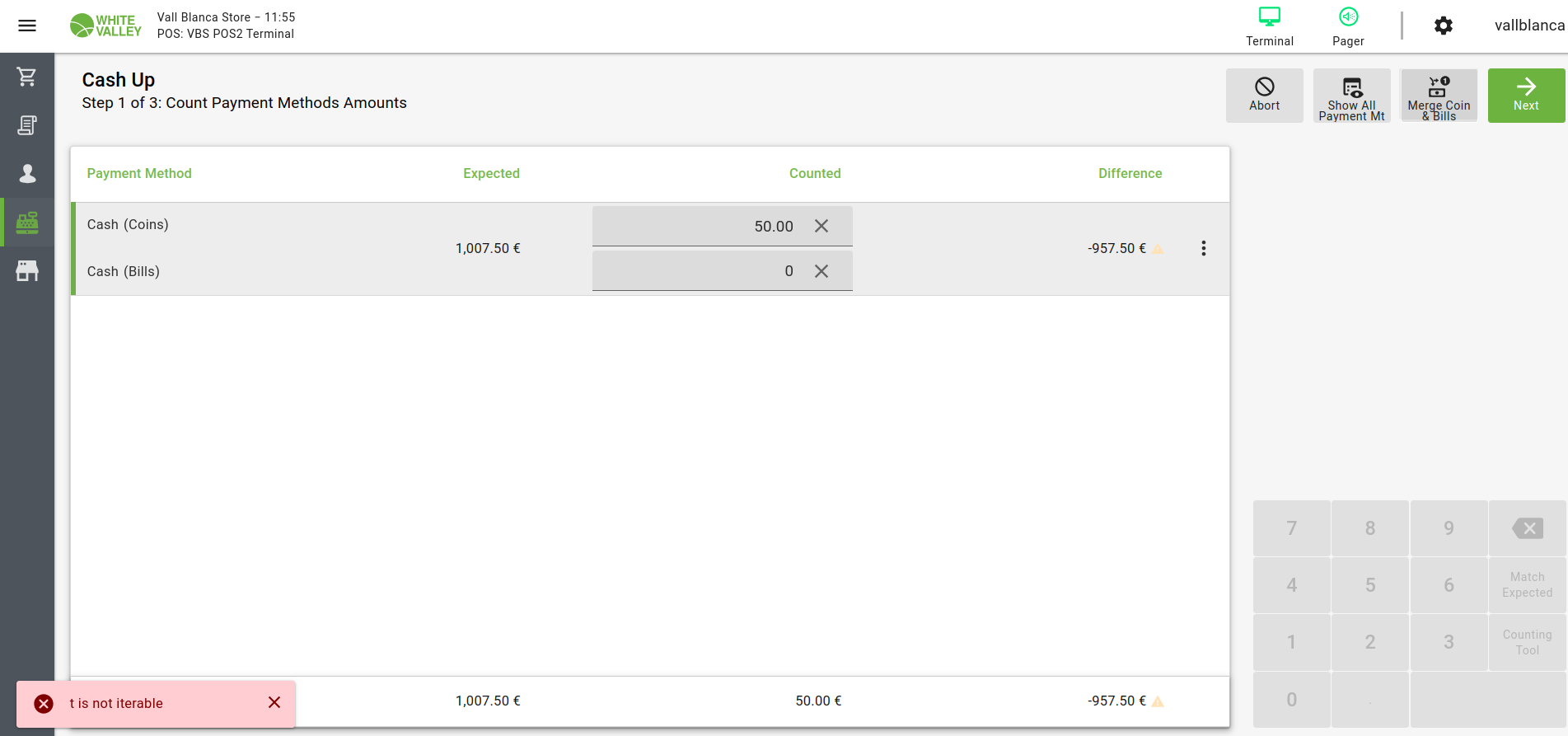 | Steps To Reproduce | Log into a POS2 terminal user: vallblanca password: openbravo add an avalanche transceiver to the receipt click on the pay button click on the cash button click on the done button go to the side menu and click the till button select the close till option in the submenu click on the Split coins & bills button in the upper right corner select the Cash(Coins) field click on the Counting tool button in the pop up window add a 50€ bill and click on the OK button (lets you finish the cashup, it shouldn't) click on the Merge coins & bills button "Cannot read properties of undefined (reading 'find')" error appears | |||||||