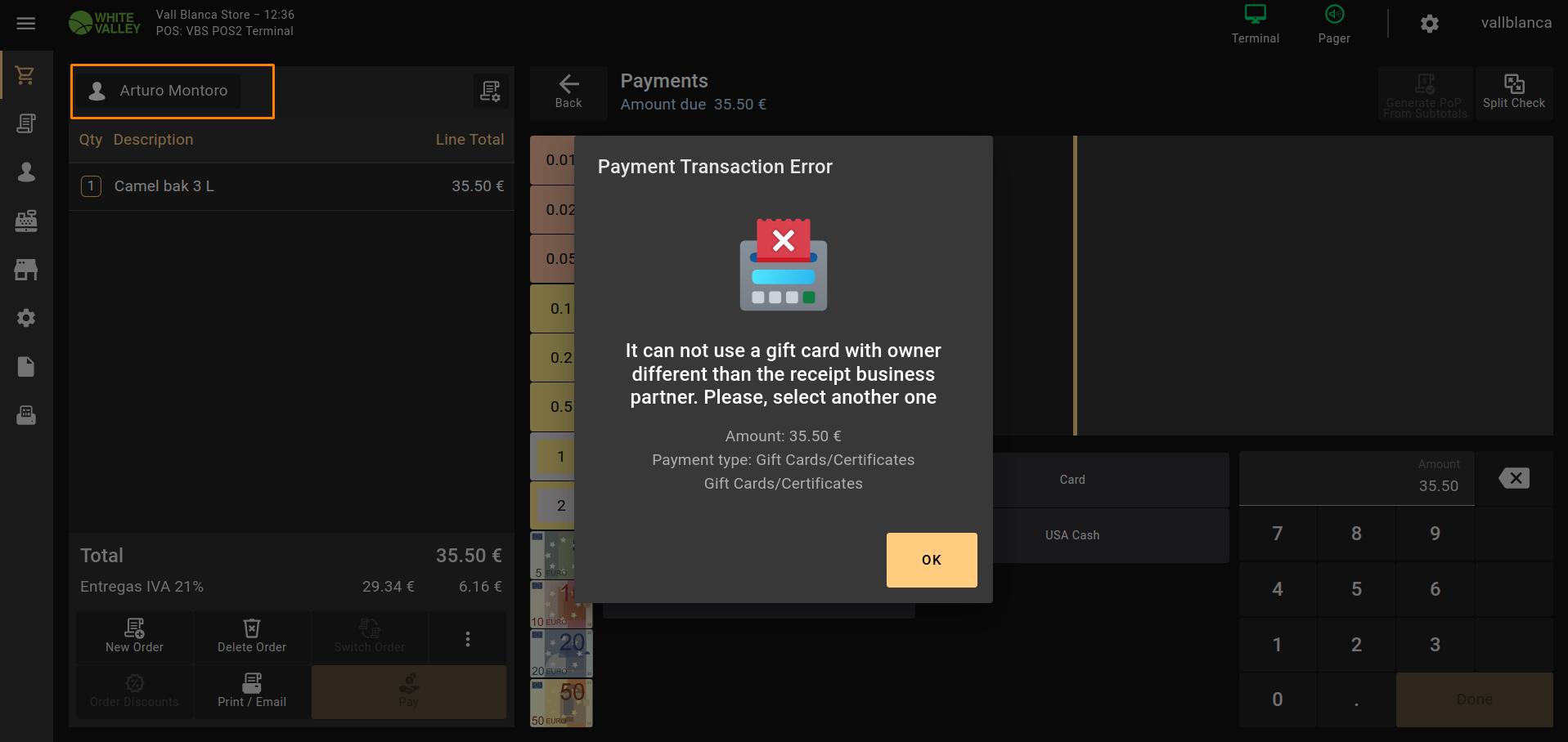 | Steps To Reproduce | 1.Go to POS2 User: vallblanca Password: openbravo 2.Find 'Gift Card 100' through the Search line -> Open it 3.Specify Gift Card Owner-Arturo Montoro, Identifier-1111, Description-Gift Card -> Click 'Finish' button 4.Click the 'Pay ' button -> Pay by Cash -> Click 'Done' 5.Change VBS Customer to Arturo Montoro 6.Add 'Camel bak 3L' product to the Order -> Click 'Pay'-> Select 'Gift Card' payment method 7.Select created Gift Card displayed in the pop-up Actual result: Payment Transaction Error is shown Expected result: Gift Card is displayed in the 'Payments' area as a payment method. 'Done' button is active to complete the order | |||||||