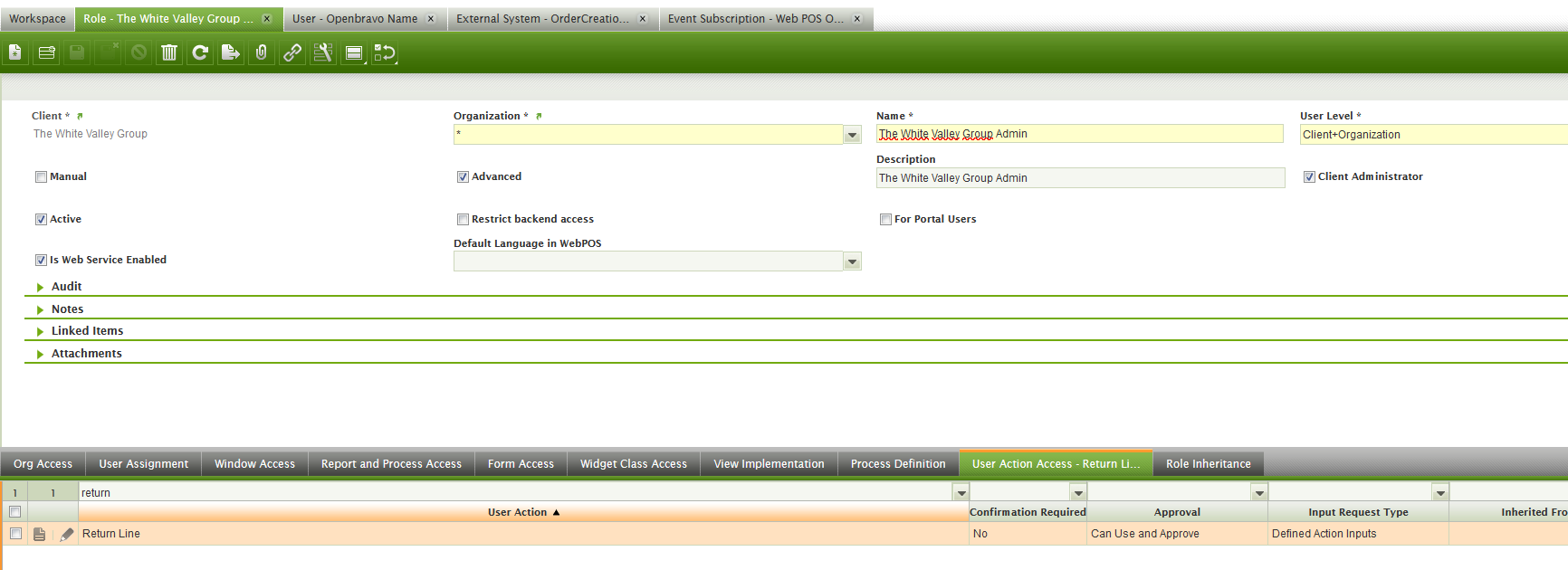 | Steps To Reproduce | In BO: - Configure an external system (see "BO Config External System.png") - Configure an event subscription with the previous external system (see "BO Config Event Subscription.png") - Configure an EDL Configuration (see "BO EDL Configuration.png") - Configure a role that requires approval for a user action (ex: 'Return Line' for role 'VallBlancaUser' - see "Role ApprovalRequired.png") - Configure another role that can approve the previous user action (ex: 'Return Line' for role 'The White Valley Group Admin' - see "Role CanApprove.png") - Configure a different Name and Username for the user that can approve (see "User Name.png") In POS, login with the user that has the role that cannot approve (ex: vallblanca/openbravo) Do the action that requires approval (ex: add the product and select 'Return Line' on it) Enter the credentials of the user that can approve previously configured (ex: Openbravo/openbravo) See "POS Approval.png" Finalize the ticket Go to the external system and check the JSON sent => The Name of the user is present in the fields 'approvedBy' See "JSON external system.png" | |||||||