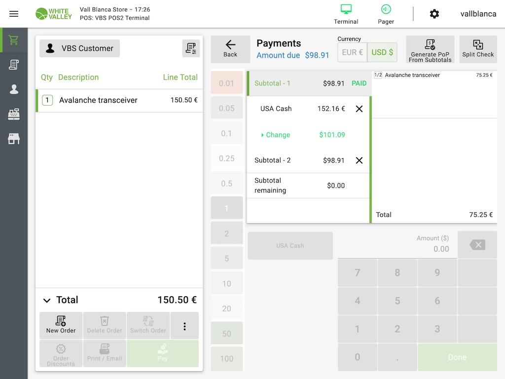 | Steps To Reproduce | POS2: VBS-2 1) Add Product 2) Pay and Split Checks 3) Pay with USD 4) Amount is not showing in dollar (euro). Its showing only in Euro. | |||||||