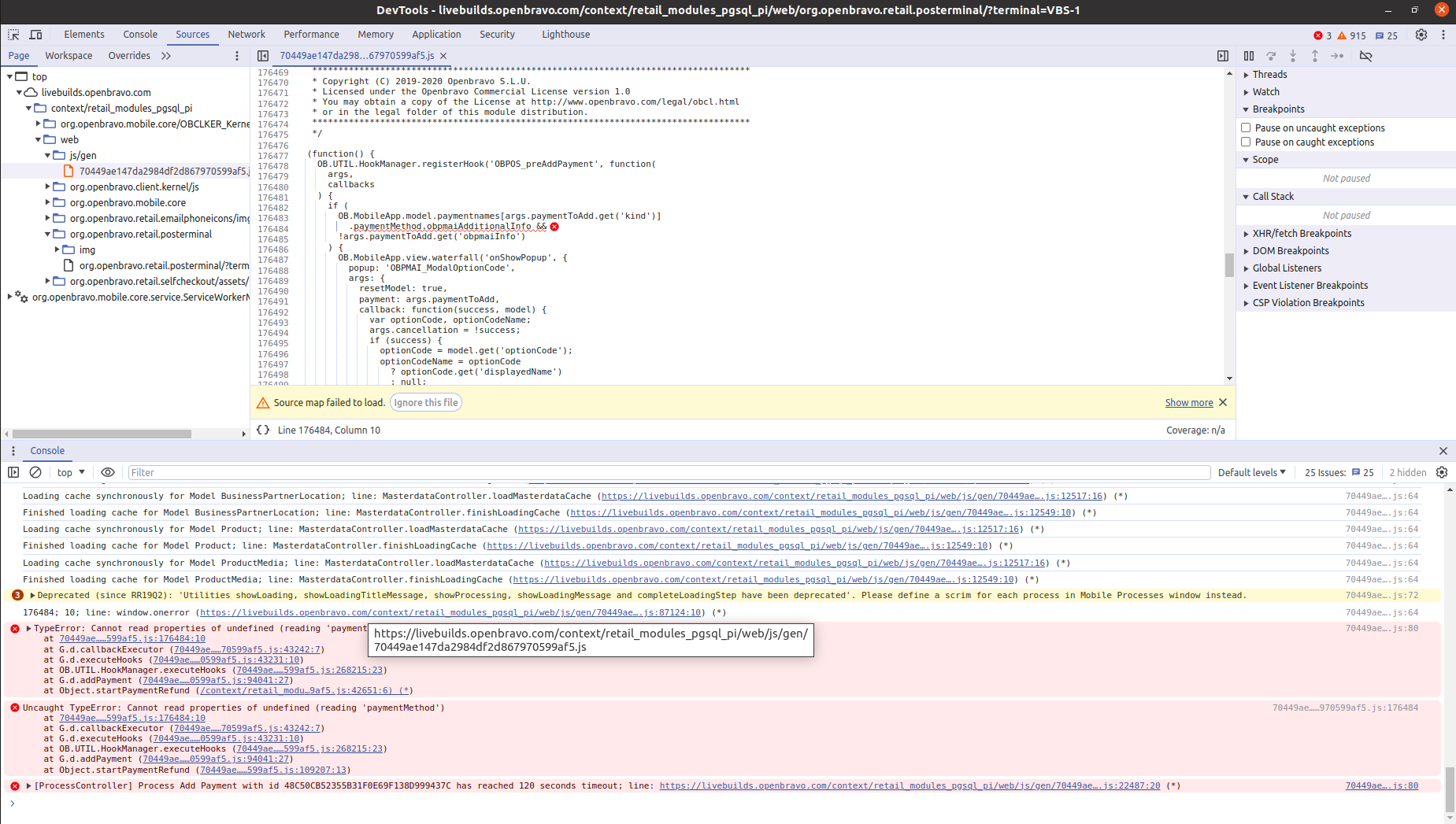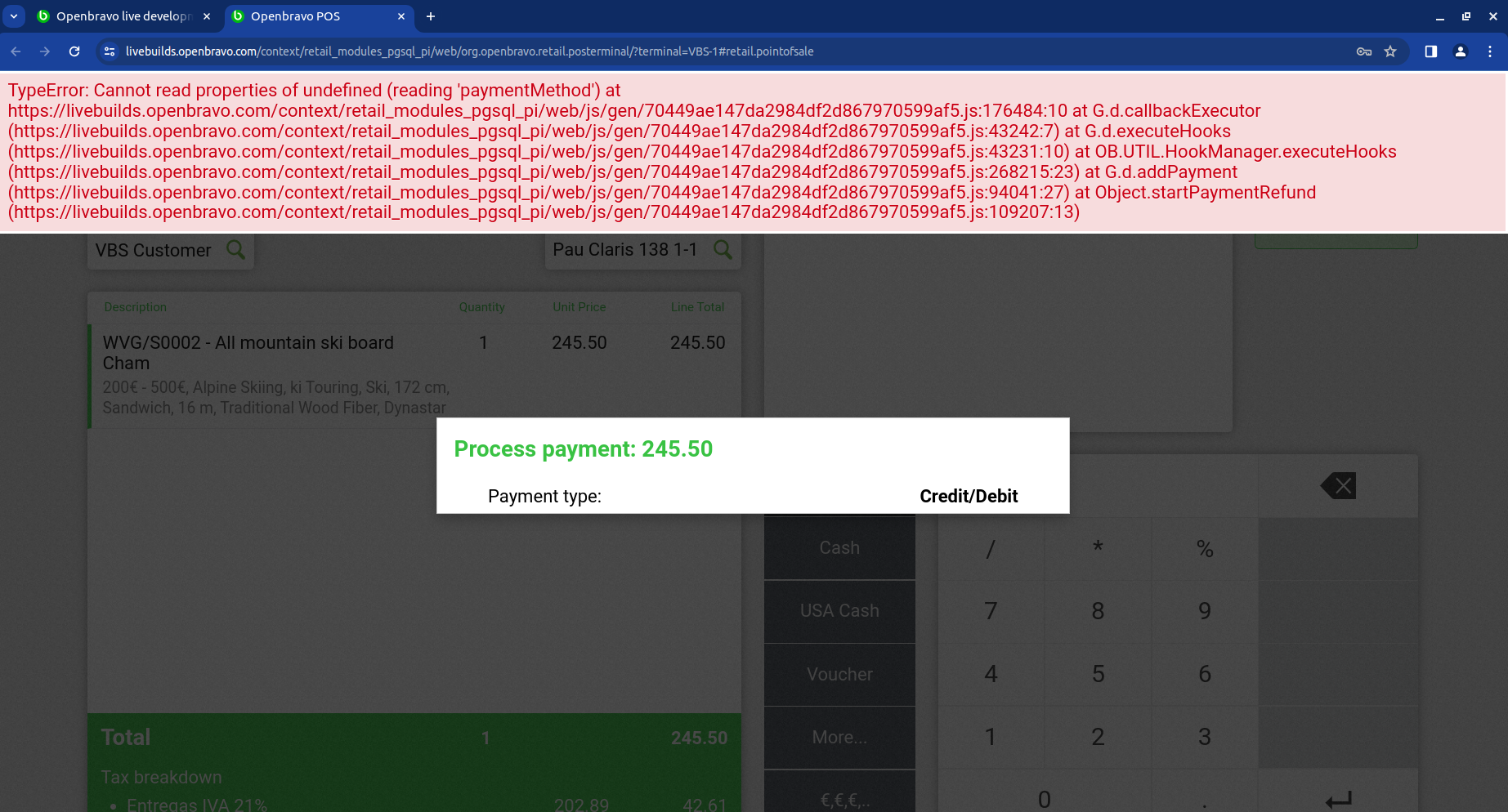 | Steps To Reproduce | -> Use an instance with the modules "org.openbravo.retail.paymentmethodadditionalinfo" and "org.openbravo.retail.discounts.bypaymentmethod". For example in livebuilds: https://livebuilds.openbravo.com/context/retail_modules_pgsql_pi/ [^] -> Steps: 1. For a terminal, configure a payment method with payment provider. 2. Open the previous terminal, add a product and try to pay with the payment method defined with payment method. -> Result: Error -> see attached images. Video provided by the Client: https://www.youtube.com/watch?v=-vT_xEH29YE [^] | |||||||