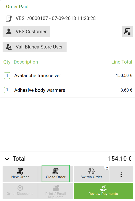 DescriptionAfter loading an already created ticket in the POS, the "Close Order" button is not being displayed in the toolbar. Instead the "Delete Order" button appears. This is not consistent with the behavior in landscape mode.