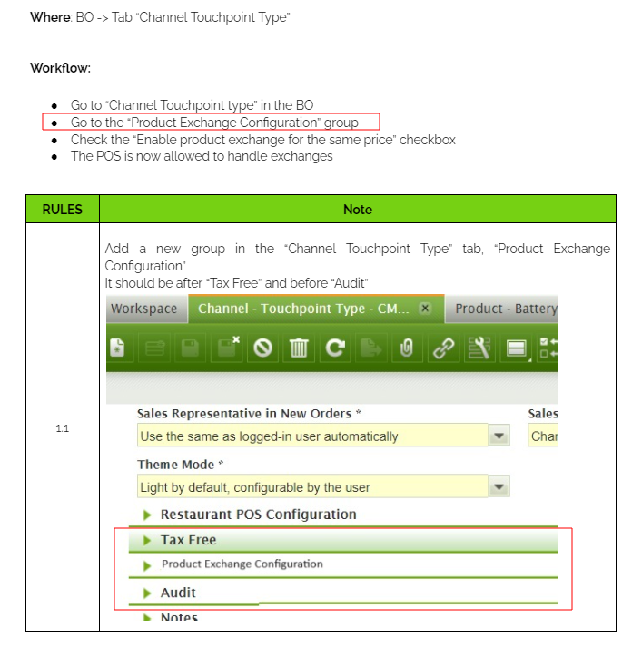 | Steps To Reproduce | go in the channel touchpoint type window you should have a section : 'Product Exchange Configuration' between 'Tax Free' and 'Audit' That should contain the following check Box : 'Enable Product Exchange' For the moment the Check Box is present but in the wrong section the 'Tax Free section' | |||||||