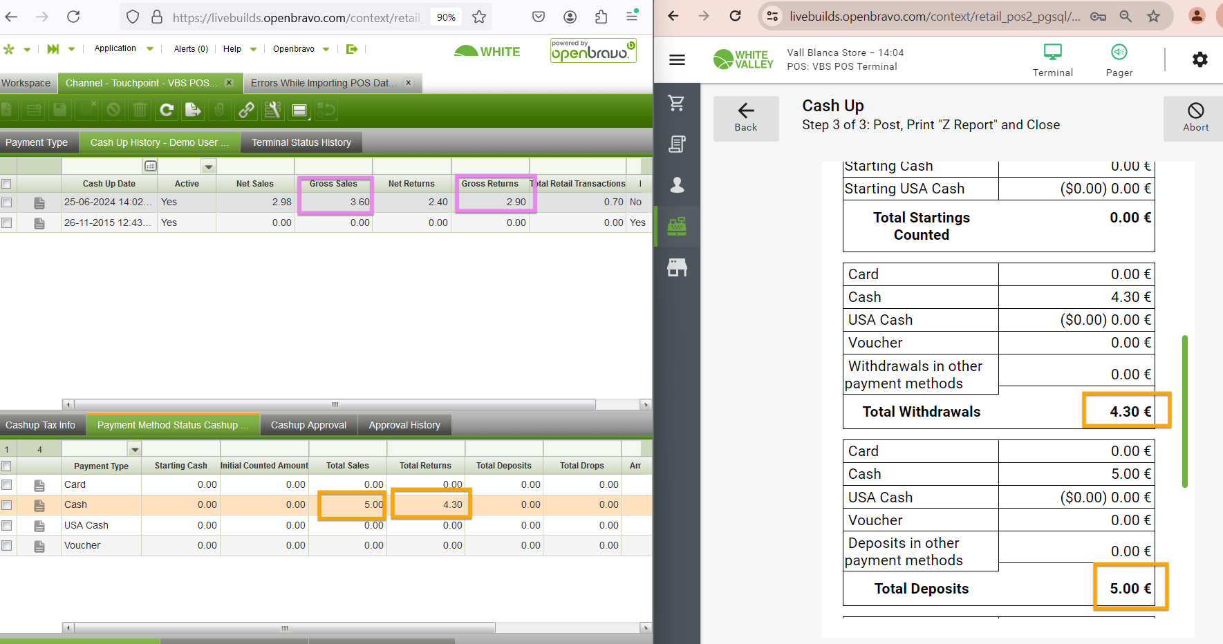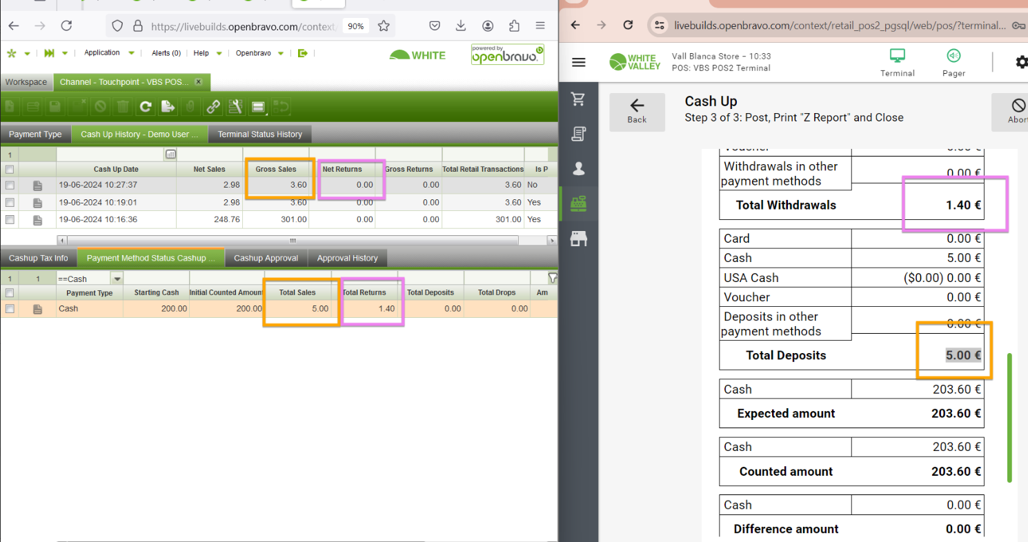 | Steps To Reproduce | - Do a sales of 3.60€ paid in cash with 5€. - Do the cash up. Check in the cash up report the 'Total Withdrawal' and 'Total Deposit' in cash. Check in the cash up history the 'Total Sales' and 'Total Returns' in cash. | |||||||