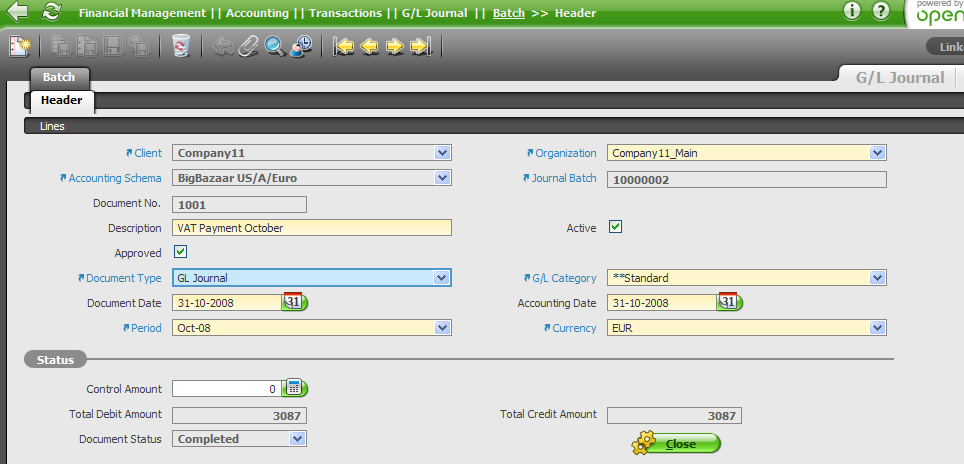 | Description | Financial Management || Receivables & Payables || Transactions || Tax Payment || Header Financial Management || Accounting || Transactions || G/L Journal I executed a Tax Payment and check the GL Journal. The Lines information is correct (see screenshot): 3087 debit, 96 credit At the header level both the credit and the debit level have 3087 as the amount, which is incorrect. | |||||||
