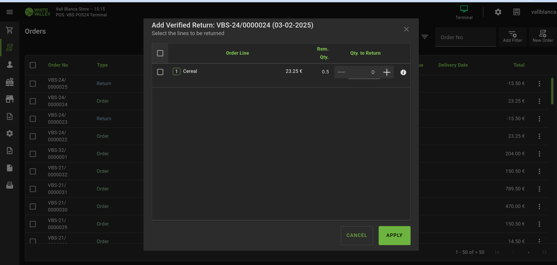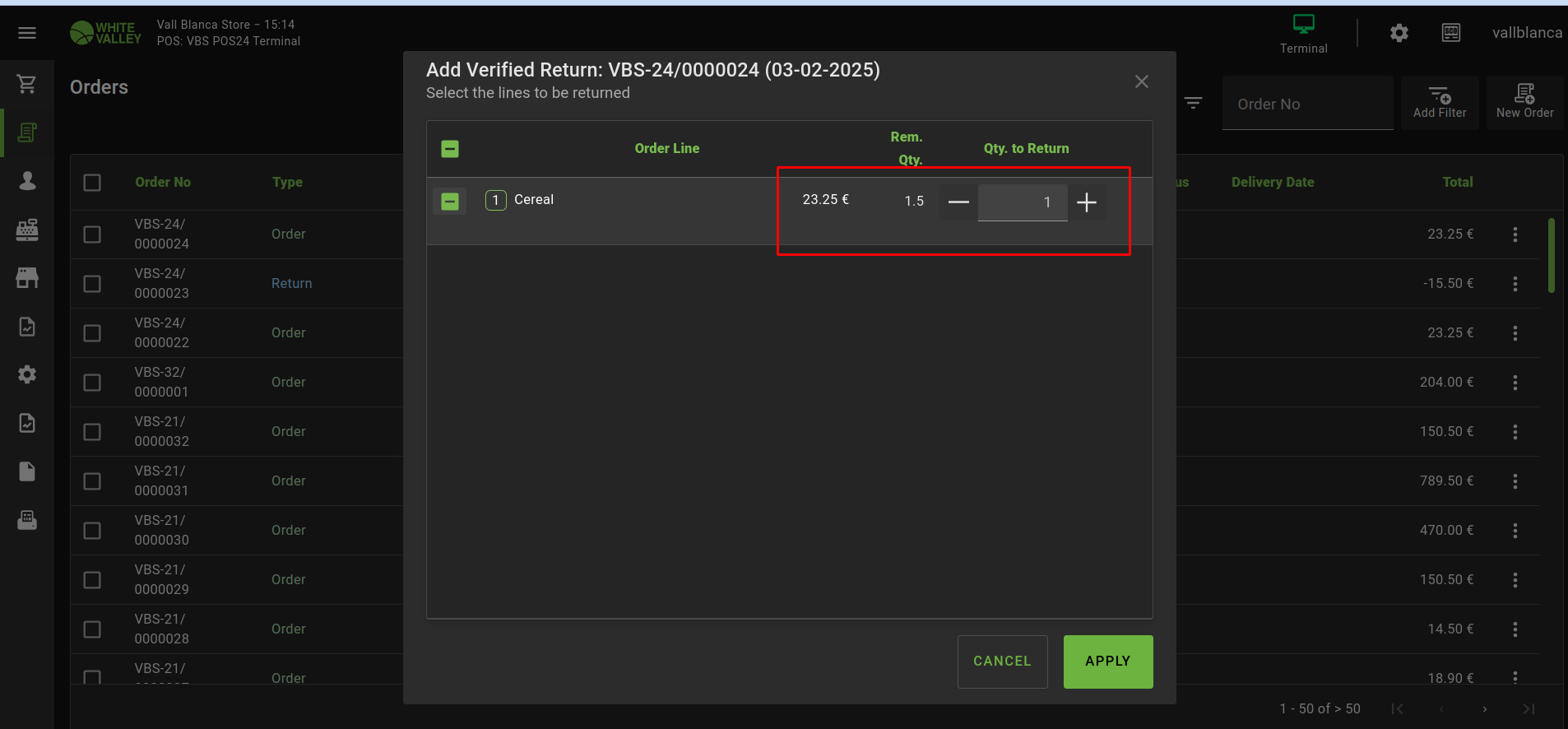 | Steps To Reproduce | 1. Log in to POS 2. Add non-unit product to the Order 3. Push the product line 4. Set the product amount equal to value with decimal (e.g. 1.5) 5. Push 'Ok' button 6. Complete the order (Clic k 'Pay', select 'Cash' and click 'Done') 7. Go to Orders → Select the newly created Order 8. Click the 3 vertical dots → Select 'Verified Returns' option 9. Tick the flag next to product to complete full return → Push 'Apply' button 10. Pay attention to the product quantity (the product quantity is equal to 1) 11. Push 'Refund' button → Complete the Order 12. Go to Orders → Select the initially created Order that was fully returned 13. Attempt to complete 'Verified Returns' once again Actual result: A remaining quantity of 0.5 is displayed, and the checkbox cannot be selected to complete the full return. Expected result: The order is fully returned and cannot be processed for return again. | |||||||