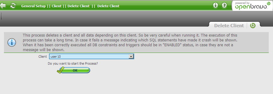 | Description | General Setup || Client || Delete Client || Delete Client Role: Admin, login Openbravo/openbravo I tried to delete a client with the Admin role and it displayed the screen, let me select the screen and values (see snapshot), however, when I click 'ok', it seems to be processing, but then comes with an error (see second snapshot). If I want to close the error, the system doesn't allow it. There is another icon with a cross at the top right corner, but it doesn't seem to have any functionality (not sure why it's there). I'm using the Training environment, which is 2.40 community. | |||||||
