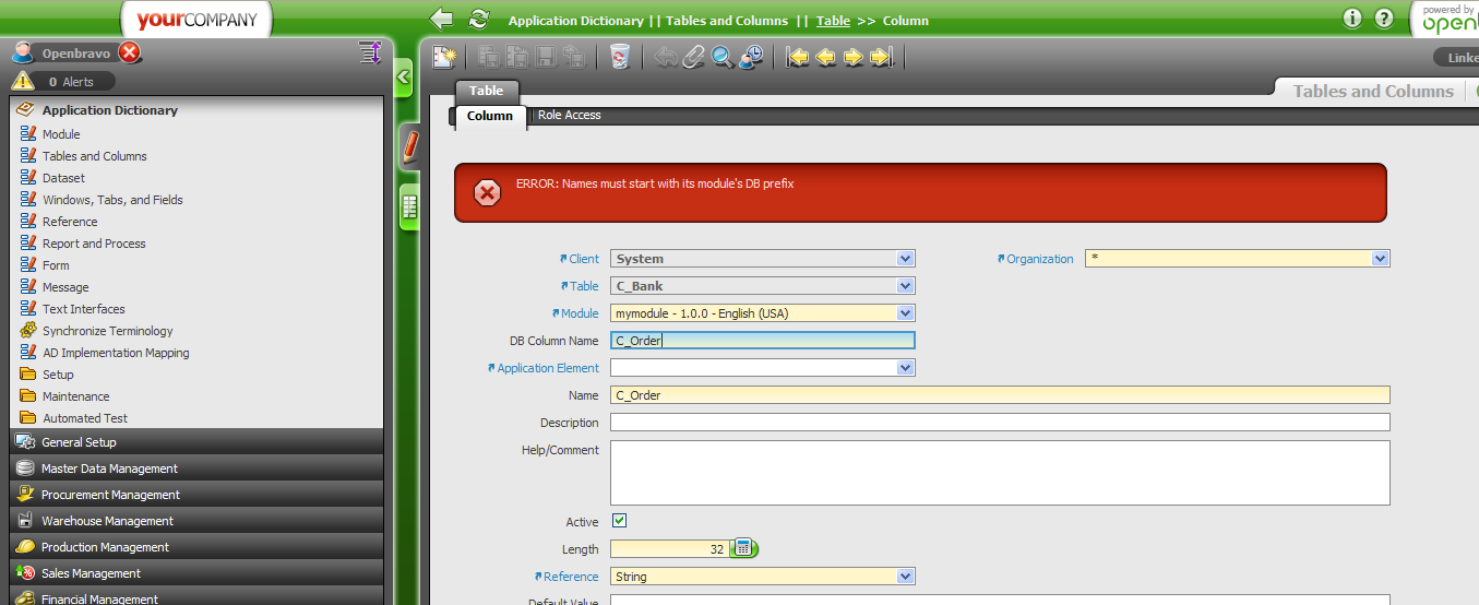 | Steps To Reproduce | 1. Go to application dictionary->Modules 1.1. Create column with name: C_ORDER in C_BANK table in the DB 1.2. Create a module with name: My module. See attach_1.png 1.3. Create a db prefix for the module. my. See attach_2.png 1.4. Create an exception for the module related to the column. See attach_3.png 2. Go to Application dictionary->Tables and columns. Select C_BANK table 2.1 Click the button Create columns from DB 2.2 Move to columns tab and select the new created column C_ORDER. See attach_4.png 2.3 Select the module Mymodule from the module combo box. The error comes. See attach_5.png | |||||||