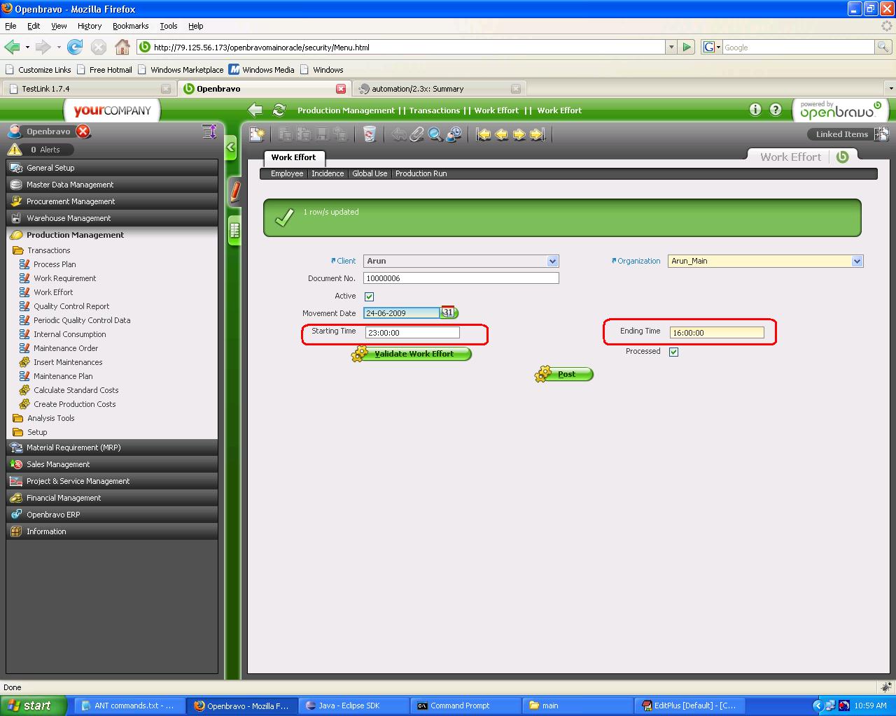 | Steps To Reproduce | # Go to Production management->Transactions->Work Effort # Click New and fill: * Movement date= Current date * Starting Time: 23:00:00, Ending time: 16:00:00 Save the record. Work Effort got saved. | |||||||||||