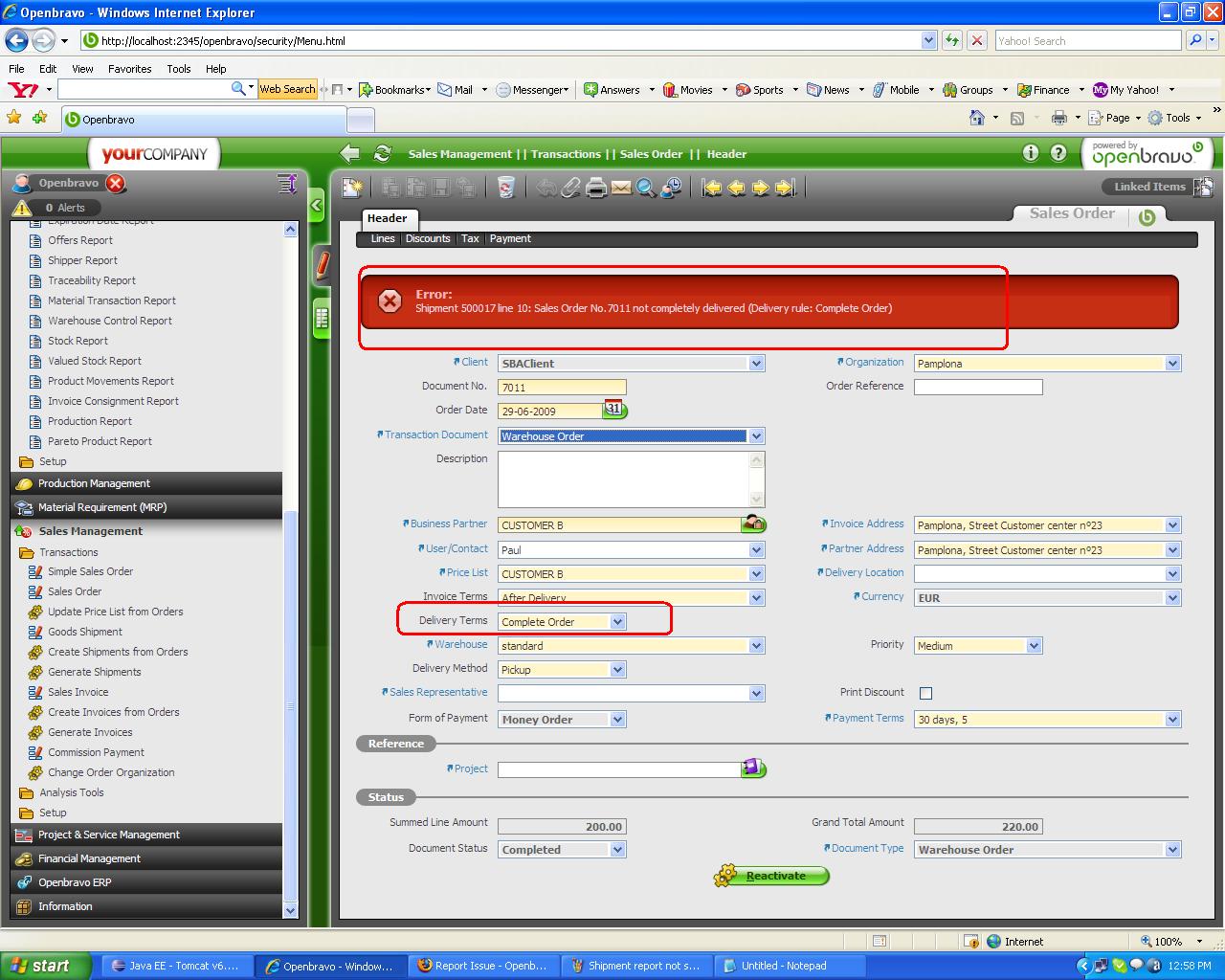 | Summary | 0009687: when sales order is reactivated with transaction document as wareshouse and Delivery terms complete order | |||||||