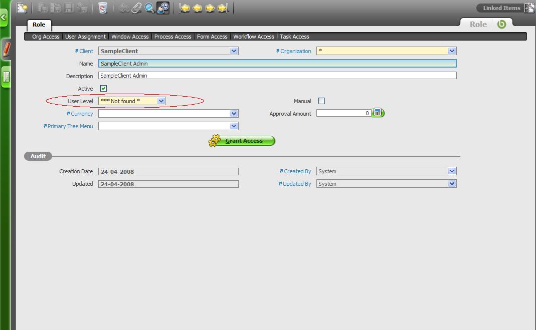 | Description | When creating a new Role, on R2.35 I have three options: Client, Client+Organization, Organization and System. The default option is Client. On R2.40.3743 I have a fifth option called "*** Not Found *" and it is selected by default. | |||||||