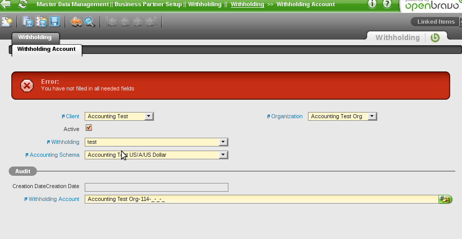 | Description | I'm not able to create a withholding account. The error shown is: Error: You have not filled in all needed fields But all editable fields have been filled. | |||||||