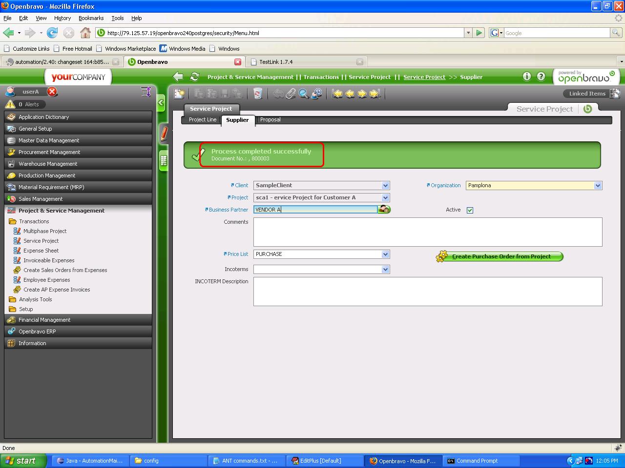 | Steps To Reproduce | # Go to Project & Service Management->Transactions->Service Project # Click New and fill: * Search Key: sca * Name: Service Project for Customer A * Create Temporary Price List: N (un-checked) # Move to Project Line tab. # Click New and fill: * Product: A Final goods * Planned Quantity: 10 * Tax: VAT 3% * Planned Price: 1.75 and verify Planned Amount is 17.5 * Planned Purchase Price: 1.2 # Go back to Service Project tab. # Select Service Project for Customer A and edit: * Business Partner: CUSTOMER A # Verify that: * Partner Address: "Pamplona, Street Customer center nÂș1" * The combo box User/Contact must have the value: Alfred * Price list: CUSTOMER A * Form of payment: Money Order * Payment terms: 30 days, 5 # Select: * Sales Representative: Eduard # Save and click on Change Project Status button and select Order. # Verify that: * Project Status is Order. * Price List is CUSTOMER A. # Move to Supplier tab. # Click New and fill: * Business partner: Vendor A # Verify that Price List is PURCHASE. # Save and click on Create Purchase Order from Project. Purchase order is completed. Process completed successfully message is displayed in the first line. A comma followed by document number is displayed in the second line. | |||||||