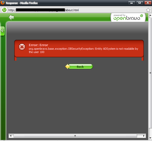 | Steps To Reproduce | 1. Enter as System Administrator 2. Navigate to any window 3. Press the top left button with the "i" image to access About box 4. You will see the correct info data. 5. Log out and enter with an Admin user 6. Open about box again 7. Error window with an incorrect Back button is displayed (see attach) | |||||||
