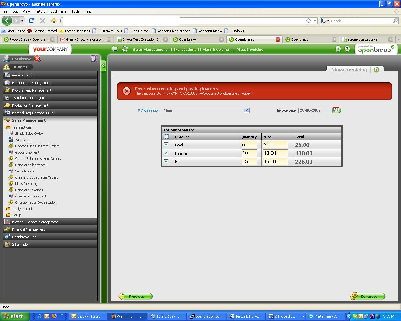 | Steps To Reproduce | Prerequisite: PI context should be installed with two modules (1) Multiple business partner selector (2) mass Invoicing Login as Openbravo/openbravo in the role of Openbravo Admin Go to Sales Management || Setup || Invoice Template || Invoice Template Create a new record: Organization : Main Template: Testmain Description : Template for Main Document Type: AR Credit memo Price list : General Sales Payment terms : Immediate Go to invoice Template lines and create few records with tax included for the products. Go to Master Data Management || Business Partner || Business Partner Select the business partner with the Search Key “Simpsons”. Change the Organization as B2. Check the Organization B2 in Customer tab and Location/Address tab also. Now go to Sales Management -> Transactions -> Mass Invoicing Organization: Main Business partner: Simpsons Ltd (Already this business partner’s organization, I made it as B2) Template: Testmain (this template I created for Organization main) Invoice Date: 20-08-2009 Click Next. In the next page Click Generate. Then you will see the error message.(See the attached screenshot) | |||||||