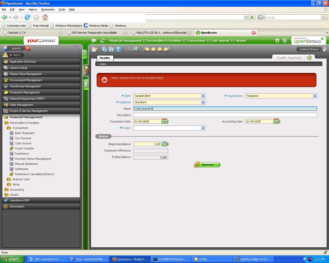 | Steps To Reproduce | # Login as userA # Go to Financial management->Receivables and Payments->Transactions->Cash journal # Click New # Enter the name as "Cash journal A". # Save the record. An error message has been displayed "Input:inpuser2Id is not an accepted input" (Please refer the screenshot) | |||||||