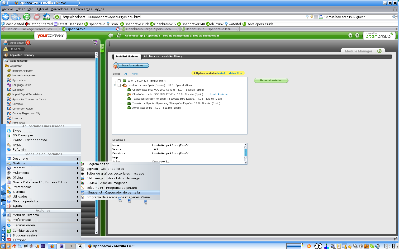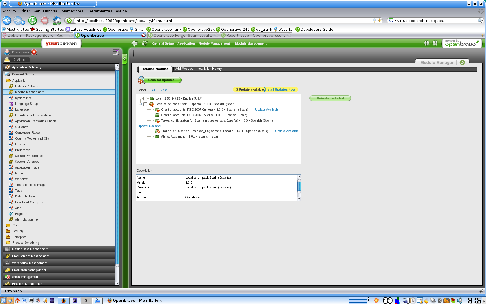 6- Again in the Module Management console, I click for updates and another module is displayed to be upgraded (see mmc1.png). But the most import thing is that one of the modules (Taxes for Spain version 1.0.5) has been installed without a mandatory dependency (the Spanish tax module improved 0.0.5), which is available in the Central repository and in the new version of the Spanish Localization Pack (see nodependency.png)
