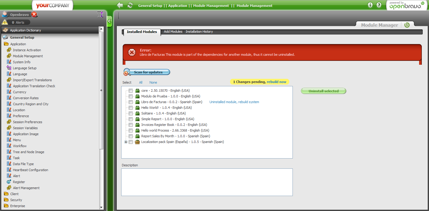 | Steps To Reproduce | 1. Install Invoice Register Book and Libro de Facturas modules 2. In Module Management Console, select Invoice Register Book module and click the uninstall button. See attach. | |||||||