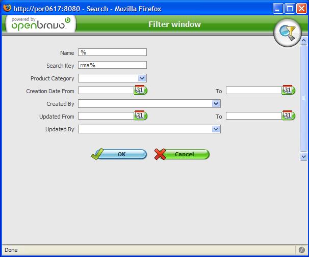 | Steps To Reproduce | 1. Open Master Data Management > Product 2. The window starts on a new record, and the search button appears 3. Enter some search criteria and click Ok button. The button does not respond. 4. Close the window, switch to grid mode and open the search popup again. Now the Ok button works fine. | |||||||