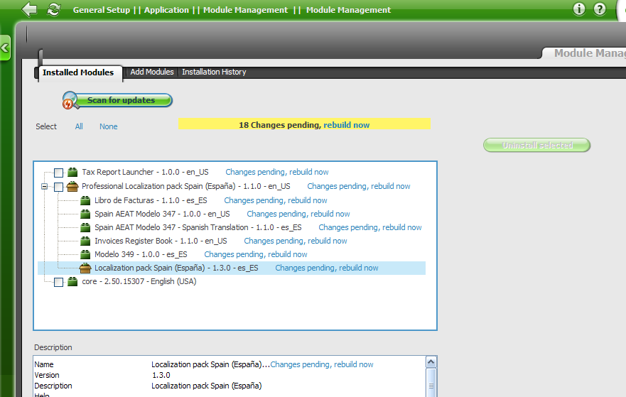 | Steps To Reproduce | Install Professional Localization Pack for Spain and look the installed modules window before and after the rebuild. | |||||||