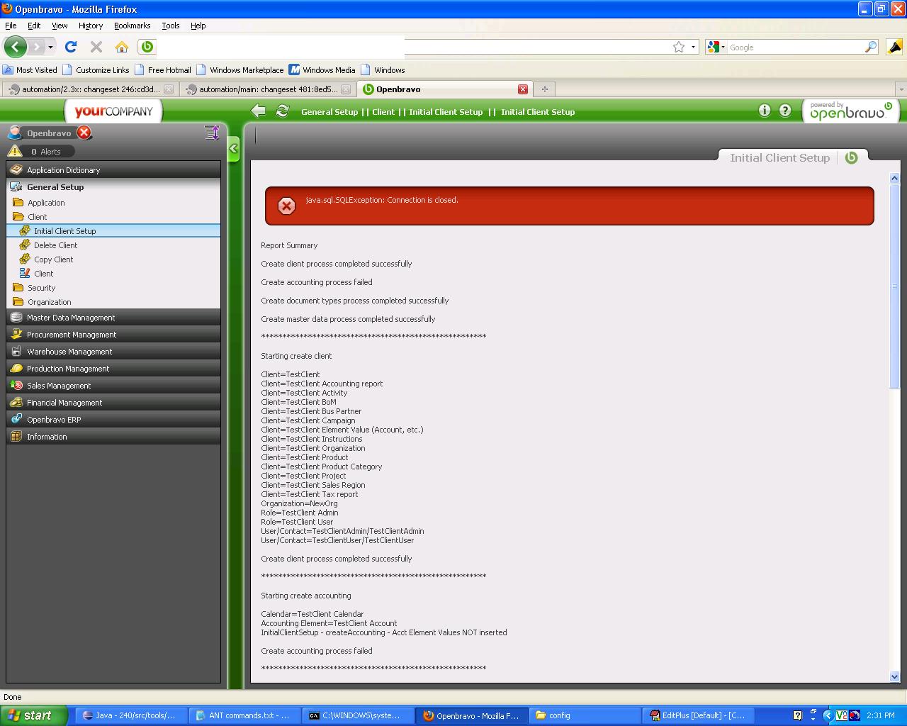 | Steps To Reproduce | Login as Openbravo/openbravo Click on icon "user info" and select the role "System Administrator" Go General Setup -> Client-> Initial client setup Fill the data and chart of accounts according Client sample data Click OK You will see an error message "java.sql.SQLException:Connection is closed" (Please refer the screenshot) | |||||||